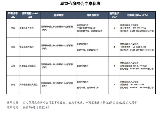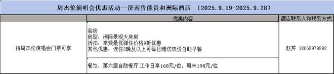 2025年9月19日至9月28日,凭济南周杰伦演唱会门票入住酒店享受优惠活动。