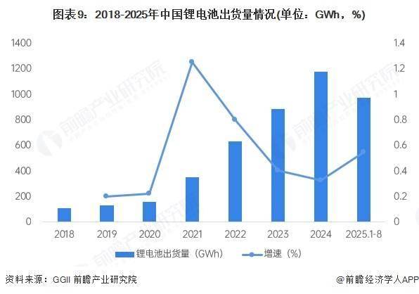 高工产研(GGII)数据显示,2024年我国锂电池出货1175GWh,同比增长32.62%。2025年1-8月出货量已达970.7GWh,累计同比增长54.3%。尽管增速在2022年后总体回落,但规模扩张势头依然强劲。