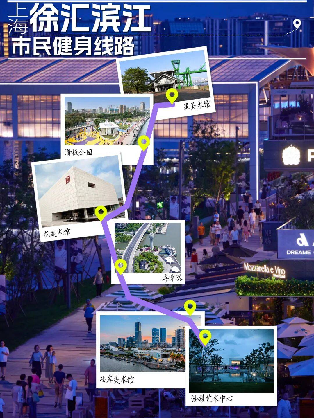 线公里。提供健身步道、滑板公园、篮球场、攀岩墙等多样化的运动设施选择,并将油罐艺术中心、西岸美术馆、海事塔、龙美术馆、星美术馆、滑板公园等标志性建筑串联起来,各种体育赛事、艺术展、潮流活动贯穿全年,连同西岸成为徐汇区乃至上海的一张名片。