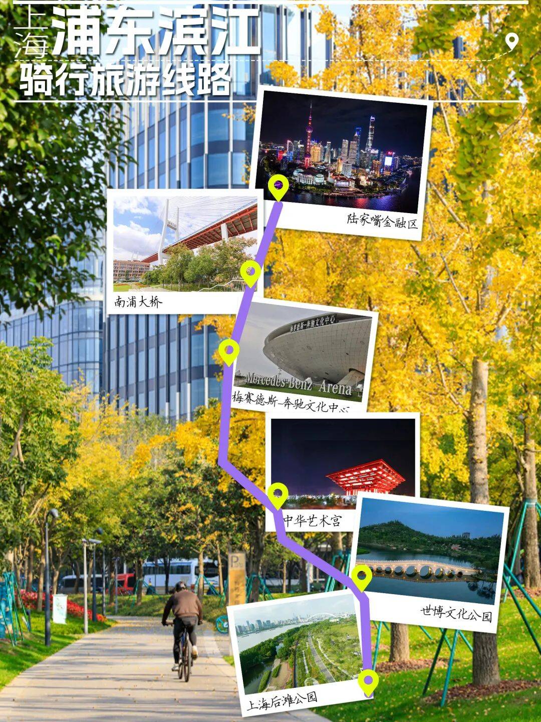 线公里。串联起陆家嘴的摩天大楼群、多座宏伟的跨江大桥以及世博文化公园、梅赛德斯-奔驰文化中心、中华艺术宫、后滩公园等众多文化地标,尽享骑行乐趣的同时可饱览魔都精华美景。沿途江面白鹭齐飞,浦江沿岸风光尽收眼底,无论是蓝天白云下的跨江大桥,还是掩映在绿道树荫中的摩天大楼,都会让你觉得不虚此行。