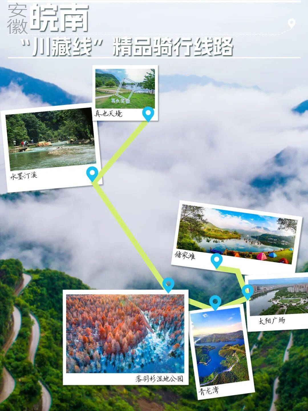 全程约33公里。久负盛名的“皖南川藏线”被誉为“江南天路”“皖南‘318’”,青龙湾碧波托起山峰座座,盘山公路在岭间蜿蜒远上云端,储家滩用明镜倒影水墨山水画卷,红杉林将天地的染色盘打翻,沿途的青山、竹海、古村与溪涧,都是对生态之美的致敬。所谓一道弯峰回路转,二道弯天地一线,三道弯云雾缭绕,四道弯千回百转,五道弯山峦叠翠,六道弯蓦然回首,多处90度以上的连续弯道盘山公路,都是对勇者之心的考验。